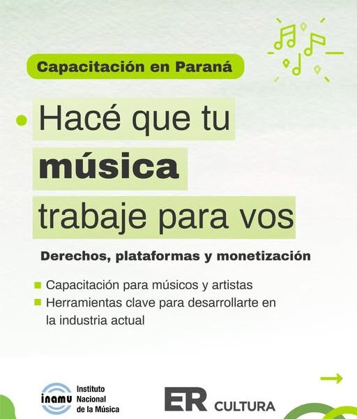 Desde la Dirección de Industrias Culturales y Creativas ,-Secretaría de Cultura de Entre Ríos-, junto al INAMU y en articulación con Tierra Bomba, te invitamos a una capacitación clave para potenciar tu proyecto musical
