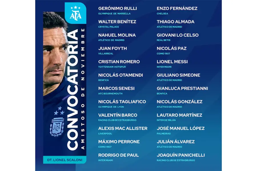 El DT difundió la nómina de 24 futbolistas que enfrentarán a la selección de Angola como visitantes en Luanda el próximo viernes 14 de noviembre, pero que antes y después de esa fecha formarán parte de un campamento de entrenamiento en España, con el fin de sumar horas de trabajo en conjunto. Hay que recordar que Argentina tenía otro partido de exhibición planificado inicialmente en India, pero finalmente se suspendió.