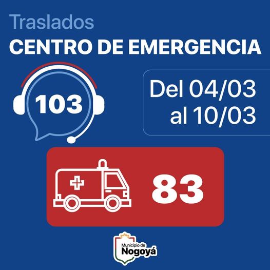 Desde el Gobierno de la Ciudad de Nogoyá informaron que el Centro de Emergencia realizó un total de 83 traslados urbanos, en el transcurso del lunes 04 al domingo 10 de marzo de 2024.