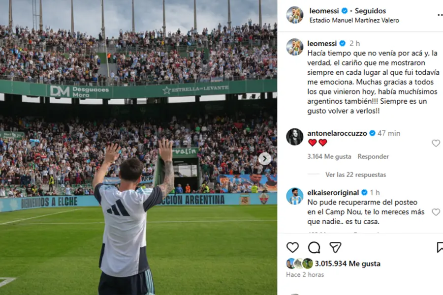 En su publicación, Messi escribió: “Hacía tiempo que no venía por acá y, la verdad, el cariño que me mostraron siempre en cada lugar al que fui todavía me emociona”. Acompañó el mensaje con varias imágenes de la práctica, donde miles de fanáticos alentaron a la Selección en la previa del viaje a África.